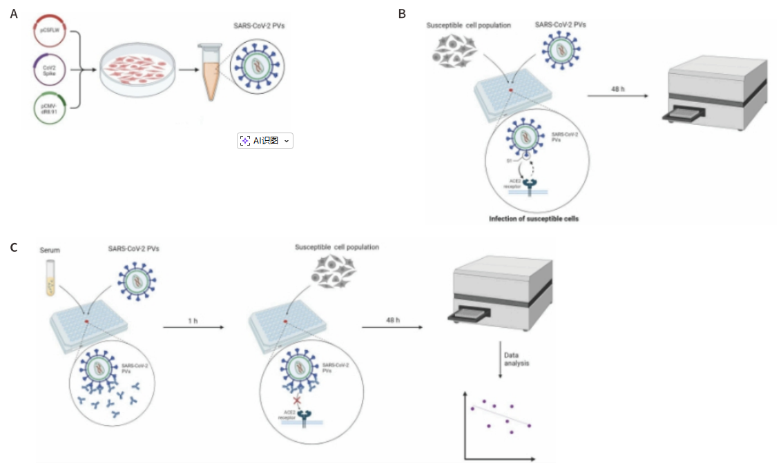 以慢病毒为例的假病毒的生产及中和抗体检测示意图(图片来源:Fantoni,Tobia et al, Journal of visualized experiments.,2023)