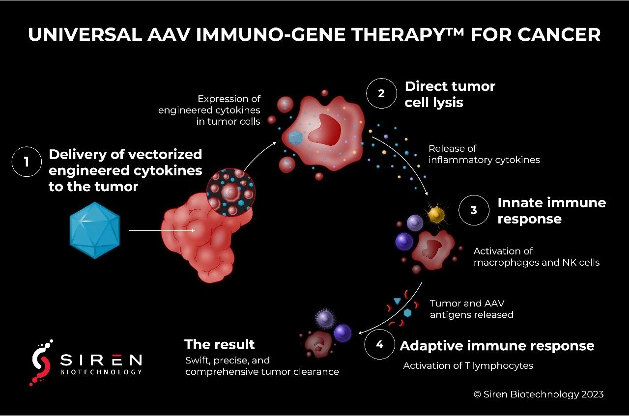 Siren Biotechnology的SRN-101是一种表达工程化细胞因子的rAAV载体,通过将AAV9载体包装的工程化细胞因子直接输送到肿瘤部位摧毁肿瘤细胞。输注部位的细胞因子表达可通过激活巨噬细胞和募集自然杀伤细胞来增强先天免疫反应,而被摧毁的肿瘤细胞释放的肿瘤抗原及AAV衣壳抗原可通过募集细胞毒性T淋巴细胞来进一步激活适应性免疫反应。该疗法采用低剂量注射局部递送至肿瘤,且当肿瘤死亡时载体化细胞因子的有效载荷活性即停止,从而保障了该疗法的安全性。FDA此前已授予该项目孤儿药和罕见儿科疾病认定。