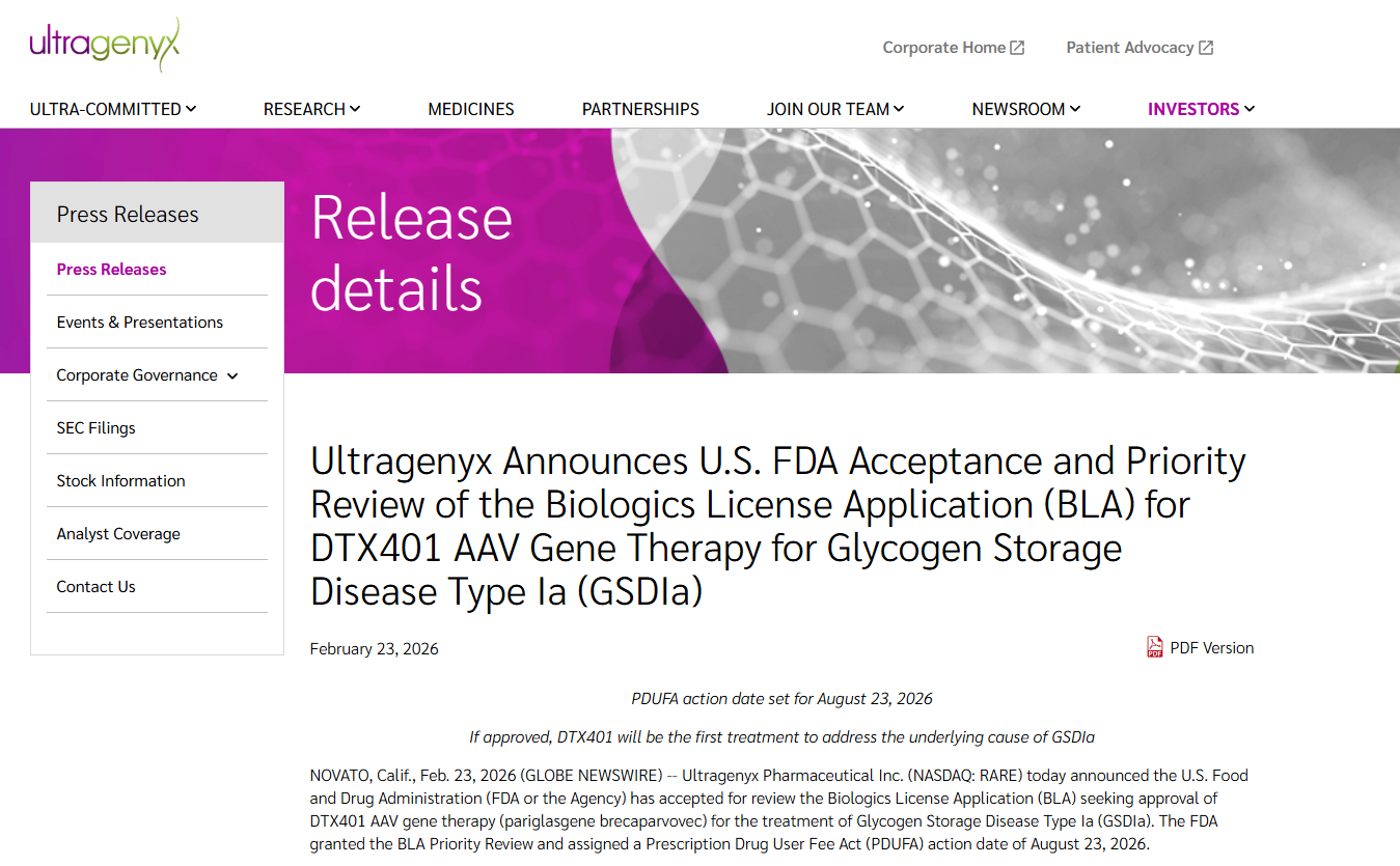 当地时间2月23日,Ultragenyx Pharmaceutical公司宣布,美国食品药品监督管理局(FDA)已受理其生物制品许可申请(BLA)并授予该BLA优先审评资格。该申请旨在批准其研发的用于治疗Ia型糖原贮积症(GSDIa)的AAV基因疗法DTX401(pariglasgene brecaparvovec)。如果获得批准,DTX401将成为首个从根本上治疗该疾病的疗法。
