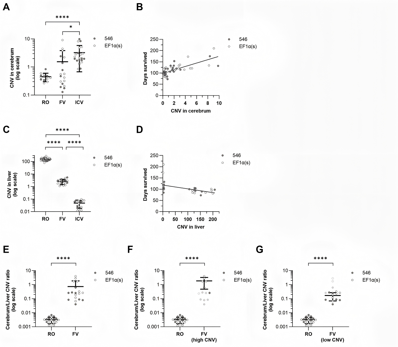 拷贝数与生存期的关联(Fig 2B, 2C):大脑中的载体拷贝数与存活时间呈现极显著的正相关(r=0.73)。尤其值得注意的是,即使在FV组中大脑拷贝数较低(类似于RO组)的亚群,其中位生存期(14.9周)也显著长于RO组(13.4周)。这进一步证实,早期干预本身就是延长寿命的独立且关键的因素。