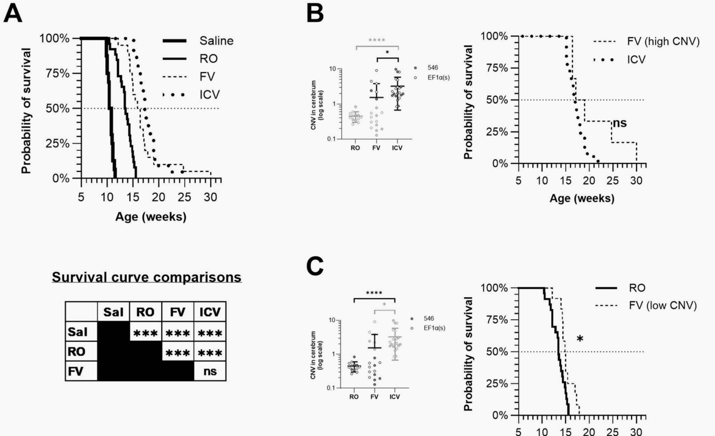 中位生存期对比(Fig 2A):未经治疗的生理盐水(Saline)对照组中位生存期仅为10.6周。断奶期给药的RO组提升至13.5周。而新生期给药的FV组和ICV组,中位生存期分别大幅跃升至16.1周和17.3周。