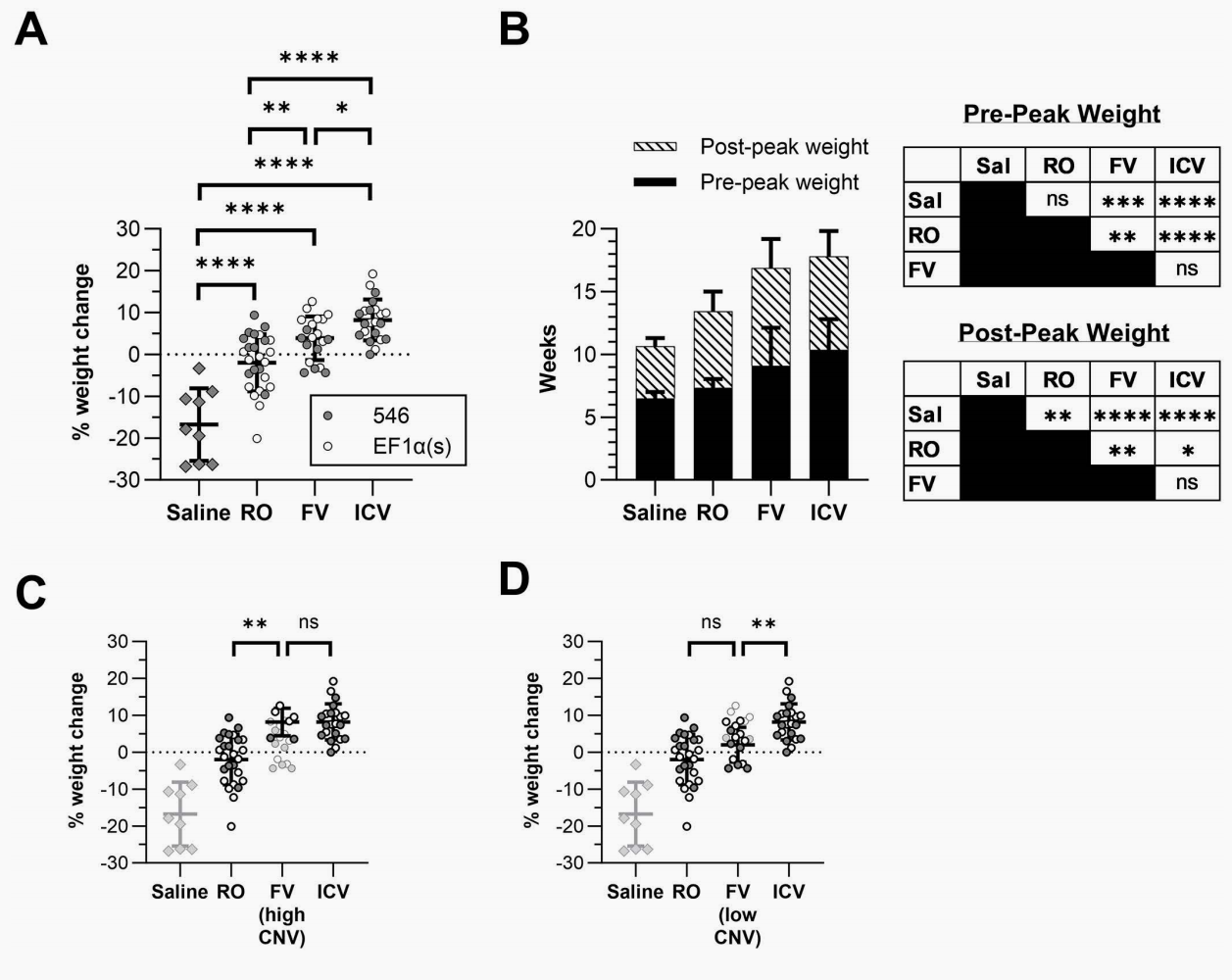 延长“正常生长期”(Fig 3B):对照组在平均6.5±0.5周龄时即达到峰值体重并开始衰退。而新生期干预不仅延缓了下降速度,还分别显著增加了到达峰值体重的时间(FV组推迟至9.1±3.0周,ICV组推迟至10.3±2.4周),为小鼠赢得了更长的正常生长期。