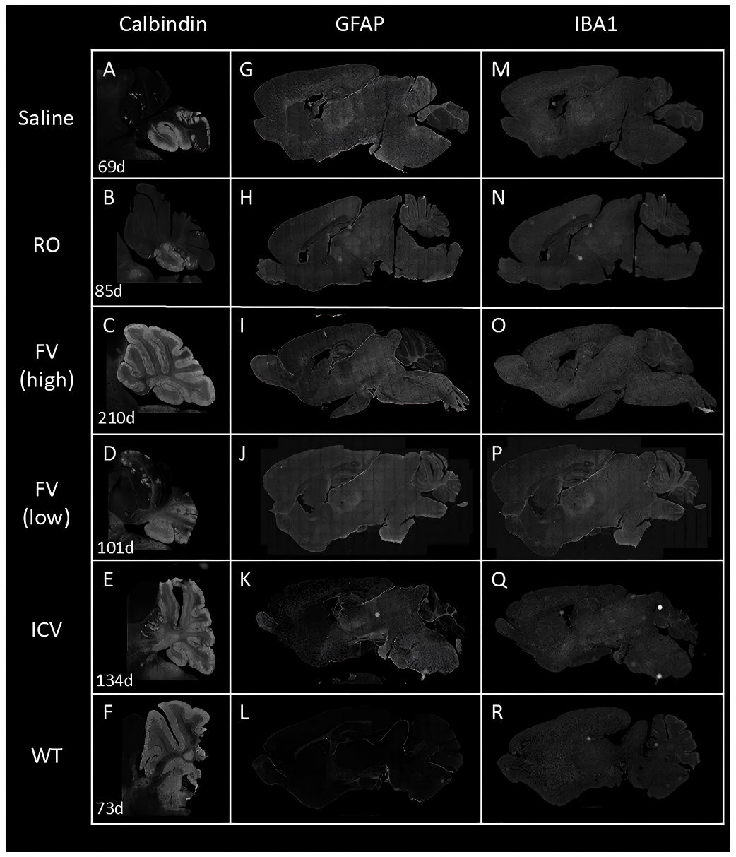 浦肯野细胞的存留(Fig 6A-E):对照组和RO组小鼠到生命后期,小脑中的浦肯野细胞几乎凋亡殆尽,仅在后叶有极少量存活。然而,新生期ICV组小鼠呈现出一致且近乎完全的浦肯野细胞保留。同样具有突破意义的是,在新生期静脉注射(FV组)中吸收药物较好的小鼠,也实现了近乎完美的浦肯野细胞保护。