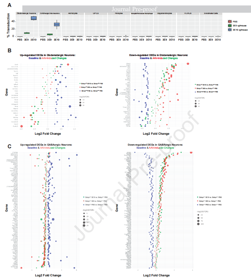 细胞嗜性与转录组逆转:单核转录组学(snRNAseq)表明,在3×1010vg/mouse剂量下,平均49.0%的皮层谷氨酸能神经元和32.4%的GABA能神经元被成功转导,而胶质细胞中的转导率接近于零(图2A)。这种神经元特异性转导有效逆转了疾病模型皮层中异常的分子特征。