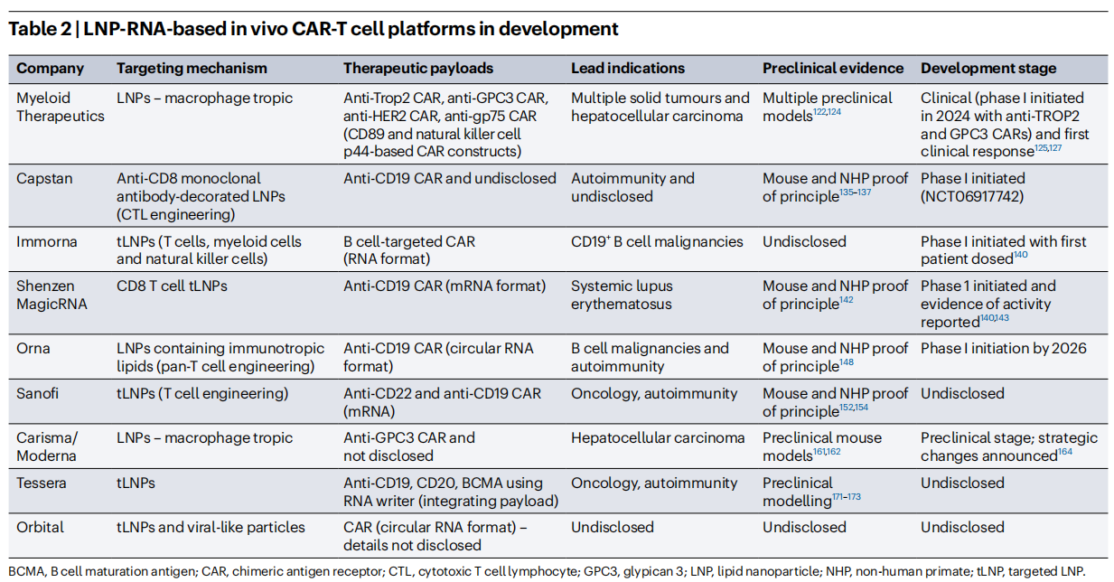 Orna Therapeutics的独特之处,在于使用免疫嗜性脂质配制的LNP,无需抗体修饰即可优先靶向免疫细胞,同时使用环状RNA作为CAR负载,延长CAR表达时间。临床前研究显示,其抗CD20 CAR制剂在NHP中可实现95%的血液B细胞清除,计划于2026年前启动I期临床试验,聚焦自身免疫性疾病与血液肿瘤。赛诺菲(Sanofi)也在开发tLNP平台,通过抗CD8抗体修饰LNP,靶向CD8+ T细胞,递送mRNA CAR,临床前研究显示可实现快速CAR表达,无脱靶激活,计划推进至临床开发。此外,Carisma与Moderna合作开发的CAR-M平台,靶向GPC3,用于肝细胞癌治疗,目前处于临床前阶段,临床前数据显示其在荷瘤小鼠模型中具有强效抗肿瘤活性。