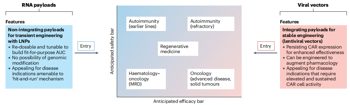第二类是“瞬时表达平台”,以LNP递送RNA为核心,CAR基因以线性或环状RNA的形式存在,不整合到细胞基因组中,实现CAR的瞬时表达。这类平台的优势是,CAR表达可通过调整给药剂量与频率进行调控,安全性更高,适合对安全性要求高的适应症,如自身免疫性疾病。