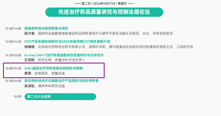 劲帆医药质量总监黄黎将于4月17日下午15:00-15:30在先进治疗药品质量研究与控制法规论坛,带来“AAV基因治疗药物质量控制和研究策略”的主题报告。届时热烈欢迎同仁莅临指导交流!