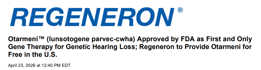 2026年4月23日,美国FDA正式加速批准再生元(Regeneron)全球首款遗传性听力损失AAV基因疗法Otarmeni(lunsotogene parvec‑cwha)上市,用于治疗由OTOF基因双等位致病变异引发的重度至极重度感音神经性耳聋,从提交BLA申请至获批仅用61天,创下罕见病基因疗法审批新速度。