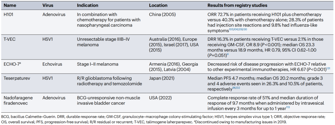 Seprehvir是一种基于HSV1716的OV,目前正在一项Ⅰ/Ⅱ期试验中,对晚期实体瘤的儿童和年轻人(11-30岁)进行评估。初步数据显示没有剂量限制性毒性。另一种基于HSV1的OV产品HF10正在与ipilimumab联合评估,用于治疗转移性或不可切除的黑色素瘤患者。初步报告显示,HF10耐受性良好,大多数不良事件的严重程度≤2级。3名患者出现了与HF10相关的≥3级不良事件(栓塞、淋巴水肿和腹泻)。24周的ORR为41%,68%的患者病情稳定。中位PFS为19个月,中位总OS为21.8个月。HF10也在晚期皮肤实体瘤患者中显示出耐受性良好。