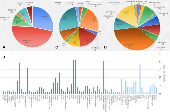 目前已有多种给药途径在各种试验中被使用,在此总结在图3D中。与目标组织相一致的是,静脉/血管给药方式仍占主导地位,其次是针对眼部应用的三种给药途径以及用于将药物输送到中枢神经系统的三种途径。根据我们目前对AAV与细胞蛋白质相互作用的理解,给药途径可能会因该环境特有的宿主蛋白质而得到增强或限制。值得注意的是,有四项试验采用了双重给药途径;这些途径未在饼状图中列出。这些双重给药途径可能需要为每种给药途径分别使用不同的衣壳蛋白,从而增加生产成本、毒理学研究等的费用。