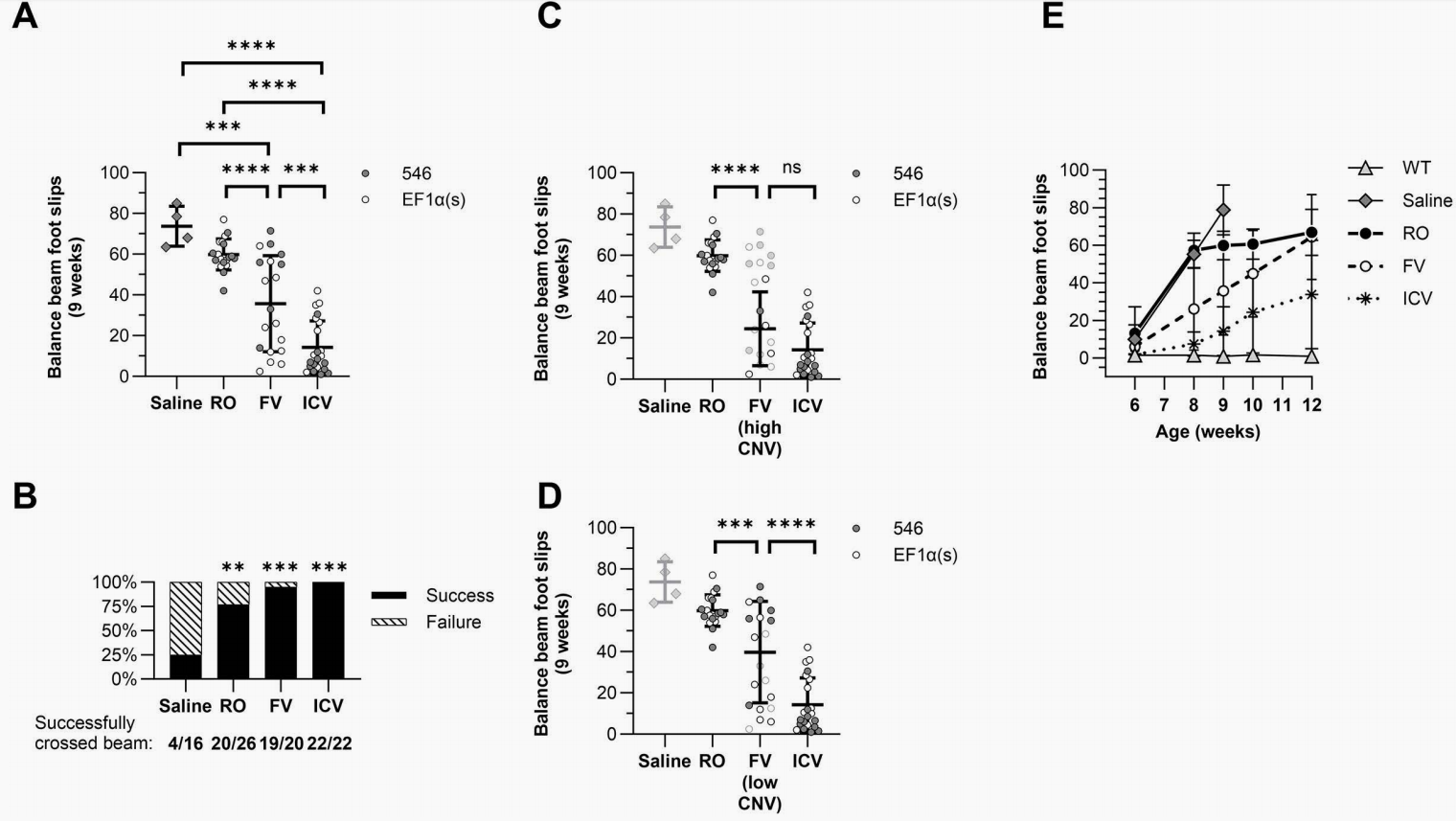通过成功率(Fig 5B):在9周龄测试中,对照组仅有25%能成功穿过平衡木。治疗组的成功率大幅提升:RO组为77%,FV组为95%,ICV组达到了完美的100%。