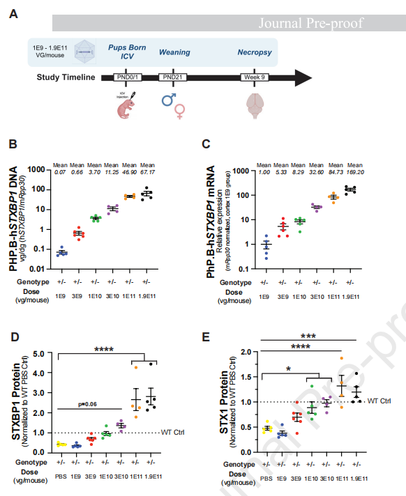 组织级表达:AAV-PHP.B-hSyn-STXBP1治疗在小鼠皮层中引起了DNA载体分布、转基因mRNA水平的剂量依赖性增加(图1B, 1C)。总STXBP1蛋白及药效学标志物STX1蛋白也呈现剂量依赖性上升(图1D, 1E)。