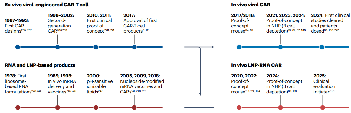 体内CAR-T疗法的诞生,是纳米技术、RNA药物、病毒学与CAR技术交叉融合的结果。这一领域的发展,大致可分为三个阶段:实验室突破、产业布局、临床转化,每一个阶段都伴随着关键技术的革新。