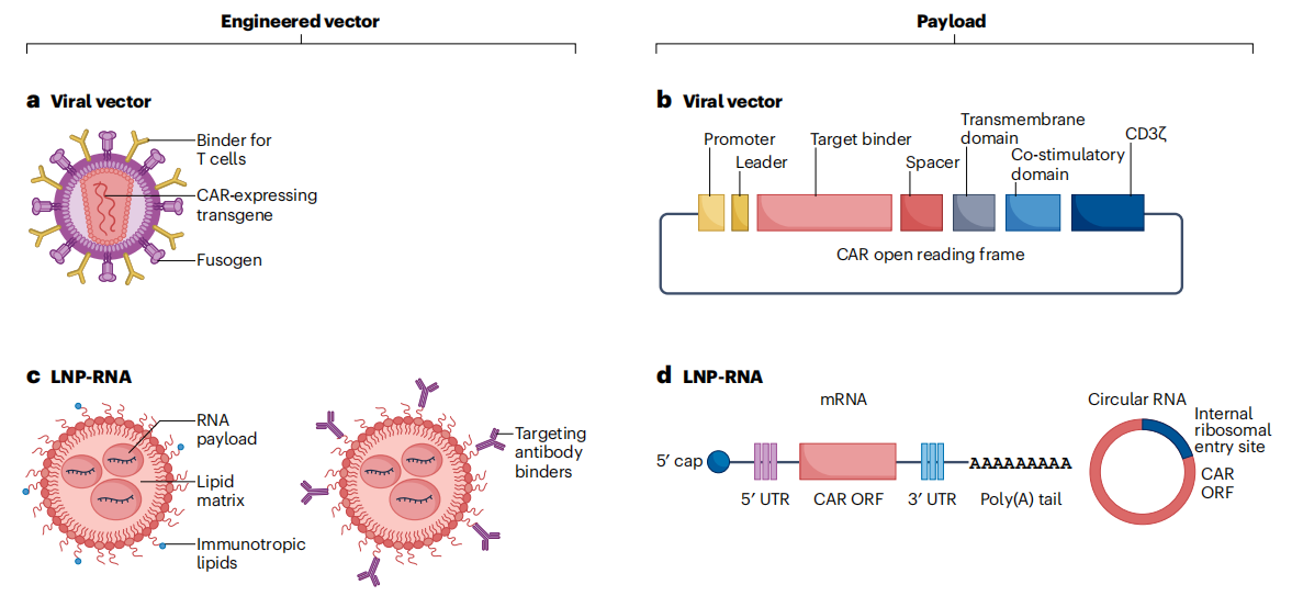 RNA-LNP平台的核心,是通过脂质纳米颗粒(LNP),将编码CAR的线性或环状RNA递送至目标免疫细胞,实现CAR的瞬时表达。这类平台的崛起,得益于COVID-19疫情期间mRNA疫苗与LNP制剂的技术突破——可电离脂质的创新,使得LNP具备高生物可降解性与低免疫原性,支持重复给药,同时通过抗体功能化或免疫嗜性设计,实现对T细胞或髓系细胞的特异性靶向。
